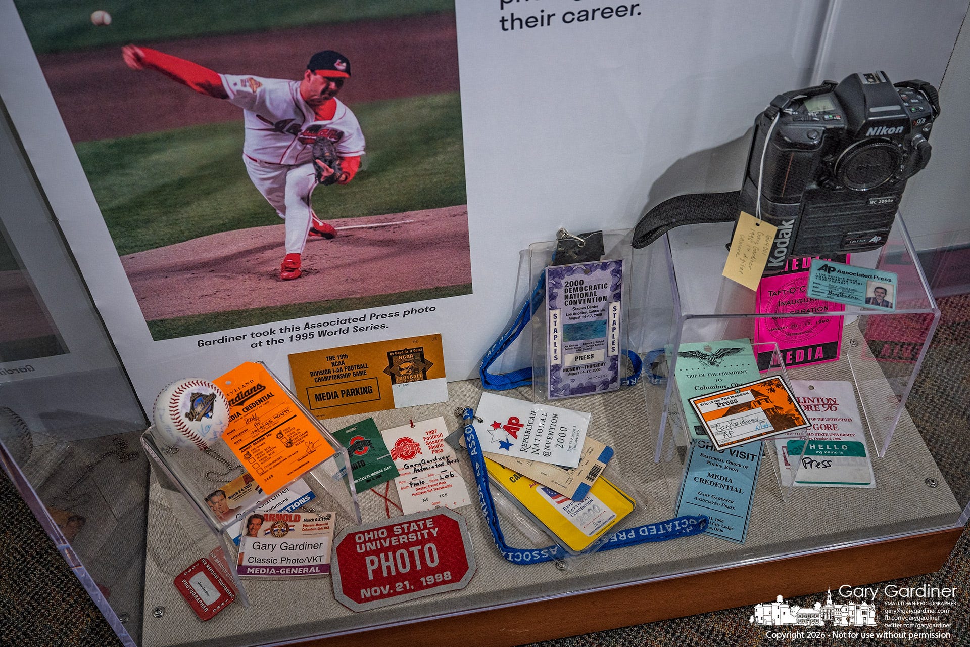The objects in the case are not just souvenirs. They are evidence of access, deadlines, long days, quick decisions, and the responsibility that came with carrying a camera for a news organization. A press pass may seem small, but at the time, it meant I had permission to stand close to events most people would only see later in a newspaper.
